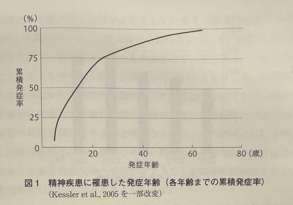 ・精神疾患に罹患した成人は、その半数が10代半ばまでに発症しており、4分の3が20代半ばまでにはっしょうしていると報告(Kessler et al., 2005;2007)