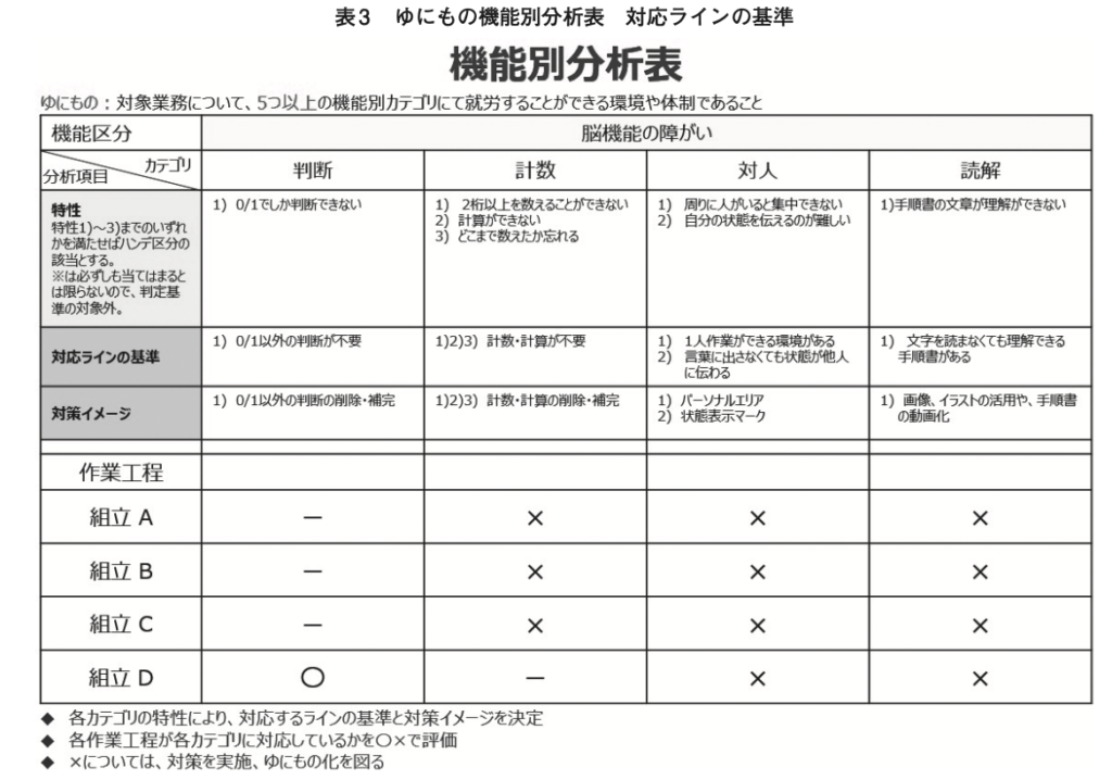 ・障害ごとに対応可能な製品ラインの基準や対策を明確にするための分析表を作成、知的障害と精神障害は、「脳機能の障害」、身体障害を「身体機能の障害」として2つの機能の障害カテゴリとして分類、脳機能の障害については、判断・計数・対人・読解という、作業に必要な能力で分類